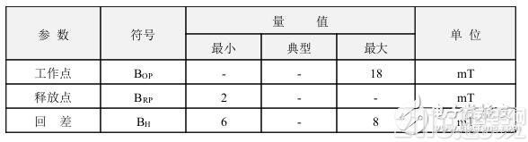 在外磁場的作用下,當磁感應強度超過導通閾值BOP 時,霍爾電路輸出管導通,輸出低電平。之后B 再增加,電路仍保持導通態。若外加磁場的B 值降低到BRP 時,輸出管截止,輸出高電平。我們稱BOP 為工作點,BRP 為釋放點,BOP-BRP=BH 稱為回差。回差的存在使開關電路的抗干擾能力增強。