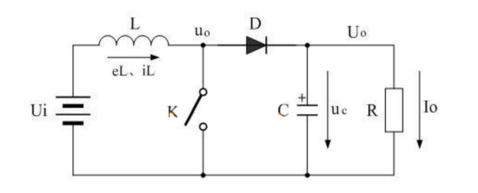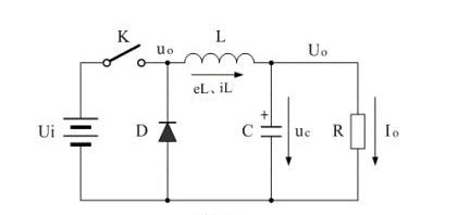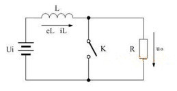 當(dāng)K接通時(shí),輸入電源開始對(duì)L加電,當(dāng)K關(guān)斷時(shí),反電動(dòng)勢(shì)與電流方向相同,但是與開關(guān)關(guān)斷前的方向相反,控制開關(guān)倆端的輸出電源等于輸入電壓與反電動(dòng)勢(shì)之和。