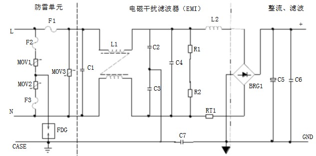 防雷電路:當有雷擊產生高壓經過電網進入電源時,由MOV1、MOV2、MOV3和F1、F2、F3、FDG1組成的電路進行保護。當加在壓敏電阻兩端的電壓超過其工作電壓時,其阻值降低,使高壓能量消耗在壓敏電阻上,若電流過大,F1、F2、F3會燒毀保護后級電路。