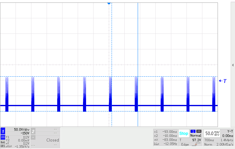 電路6:采用了恒流電路,測試的短路波形圖,用恒流電路替代電阻啟動解決了啟動和短路的矛盾。如下圖所示: