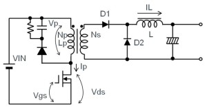 正激式只會單向激磁變壓器,在晶體管為OFF時,必須釋放(復位)蓄積在變壓器的電能。也因此必須裝上復位(緩沖)電路,圖中位于變壓器一次側的RCD。復位電路一般是由電阻/電容器/二極管組成,但基本上仍會損耗電能,因此變壓器的利用效率也不算高。而在啟動復位后,會施加DC輸入電壓1.5~2倍的電壓至開關用晶體管上,圖中的Vp和Vds的波形VR。最近能量,損耗和Vds,該電壓經由緩沖的電阻和電容器轉換。可以結合主動箝位電路,通過再生必須復位的電能,減輕損耗和Vds。