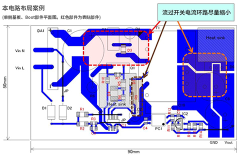 開關電源模塊利用開關的ON/OFF來控制電壓,但依然屬于模擬電路。雖然本身會發出高頻噪聲,但因擁有反饋環路,對噪聲非常敏感。也就是說,開關電源電路的路徑,必須考慮分成大電流ON/OFF后產生噪聲的路徑,以及對噪聲非常敏感的控制信號路徑?;迮渚€布局,大電流路徑應避免產生噪聲,控制信號路徑應避免受到噪聲影響。當然,這種噪聲屬于輻射噪聲,也會對EMC造成影響,因此布局必須極力避免產生噪聲。